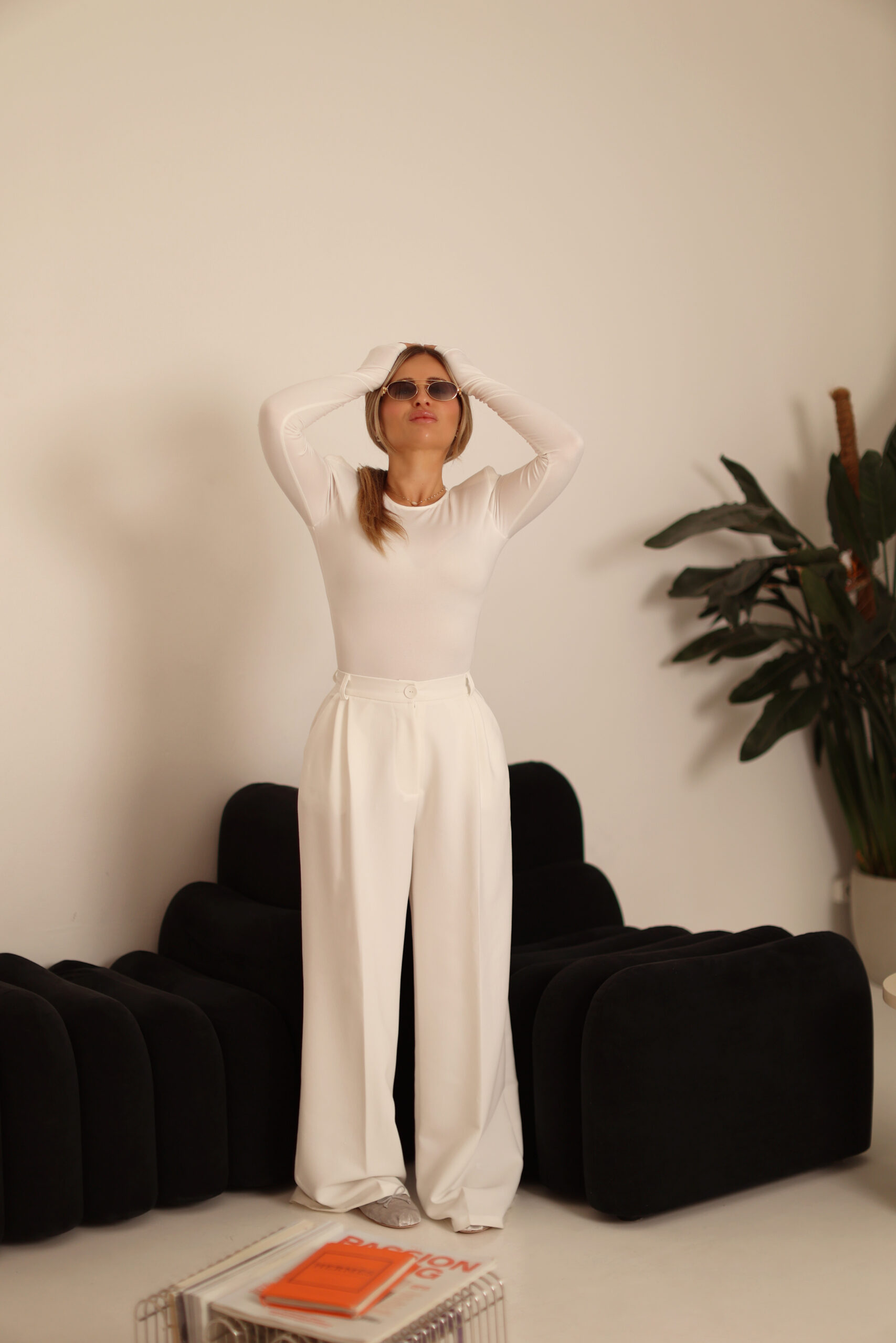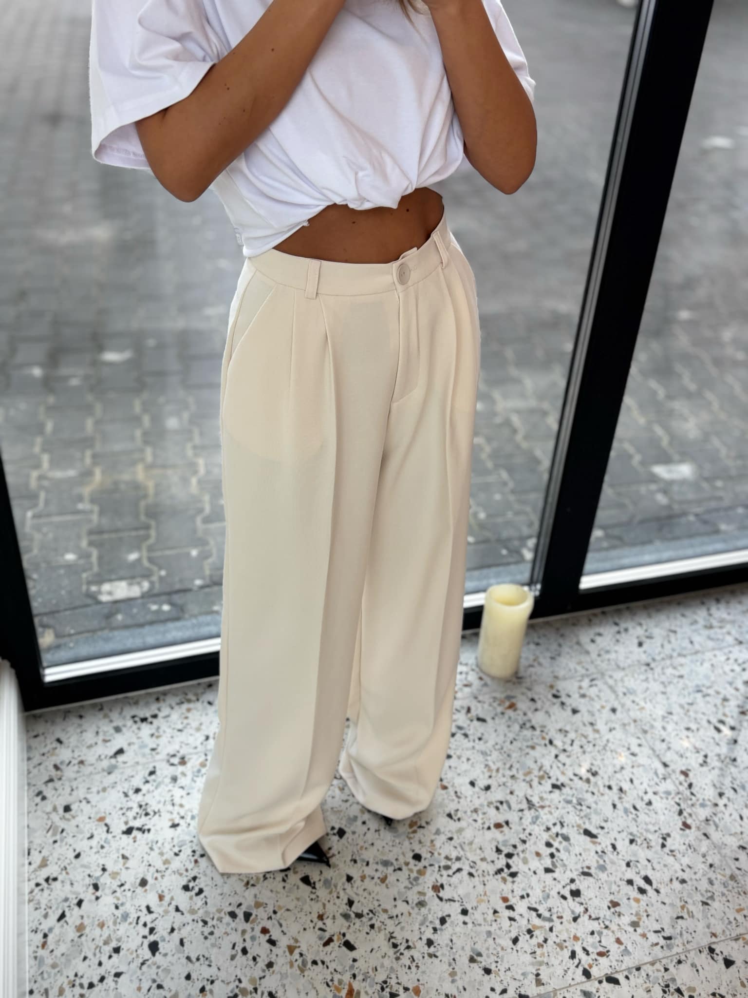 Spodnie posiadają wyższy stan który podkreśla talie oraz charakteryzuje się szerokimi nogawkami .