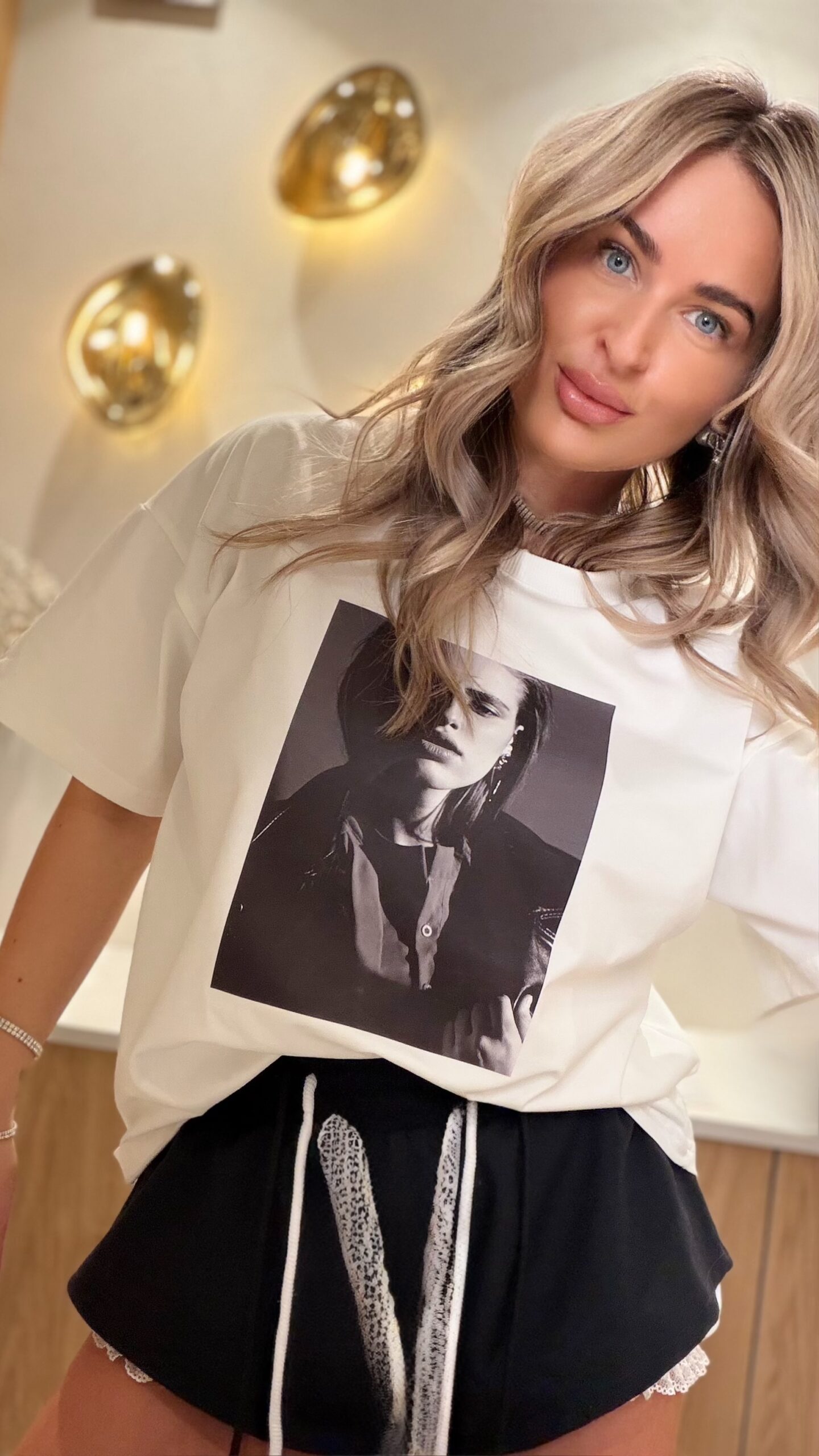 Luźny fason zapewnia komfort noszenia i swobodę ruchów, a wysokiej jakości materiał jest miękki w dotyku i przyjemny dla skóry. Kontrastowa grafika w czerni i bieli sprawia, że T-shirt doskonale komponuje się zarówno z casualowymi, jak i bardziej eleganckimi elementami garderoby.
